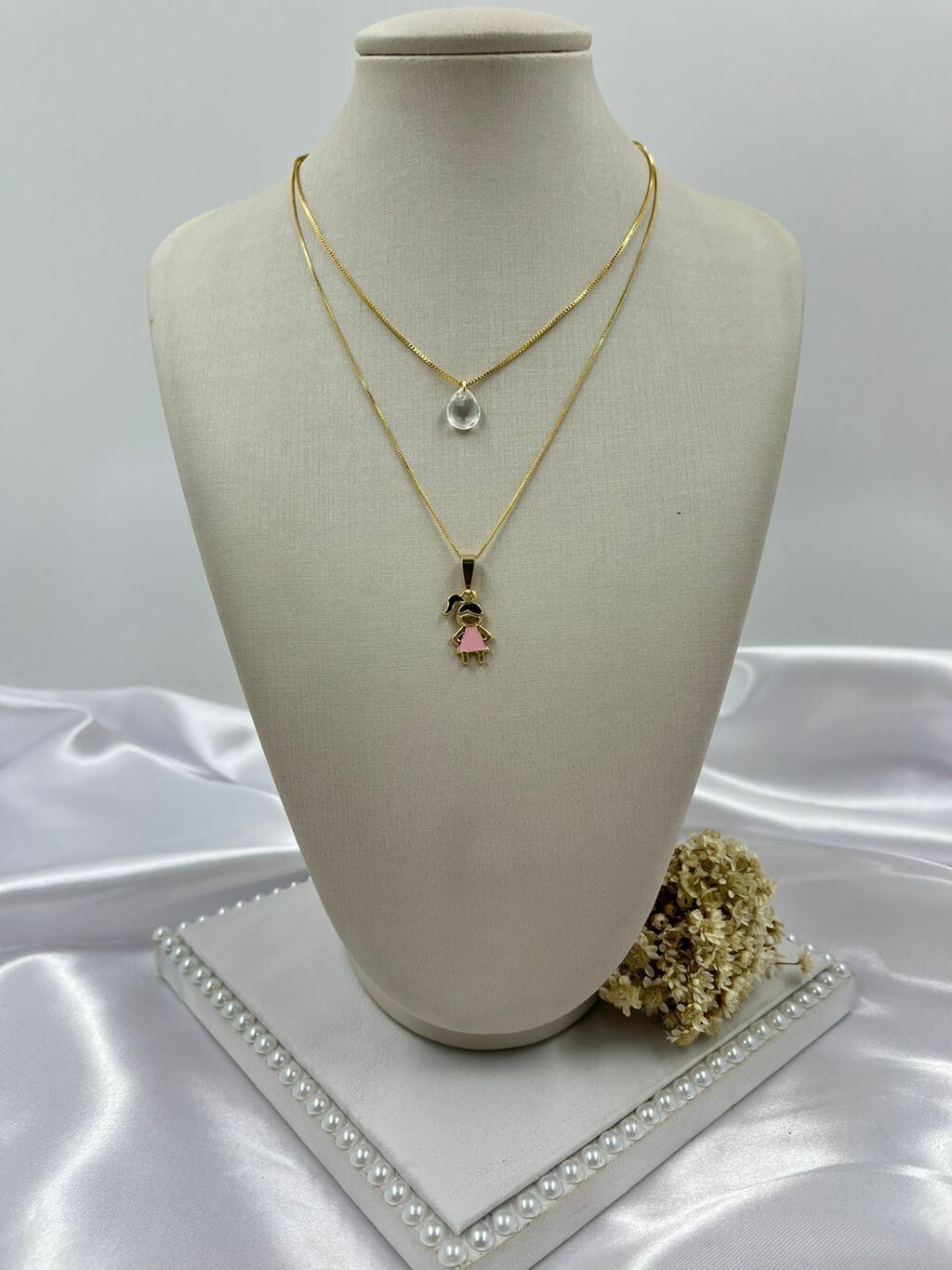 Este colar duplo é uma peça única que combina elegância e significado. Com um pingente de 1 menina e uma gota de cristal , ele é perfeito para quem busca um acessório que simboliza amor e proteção.