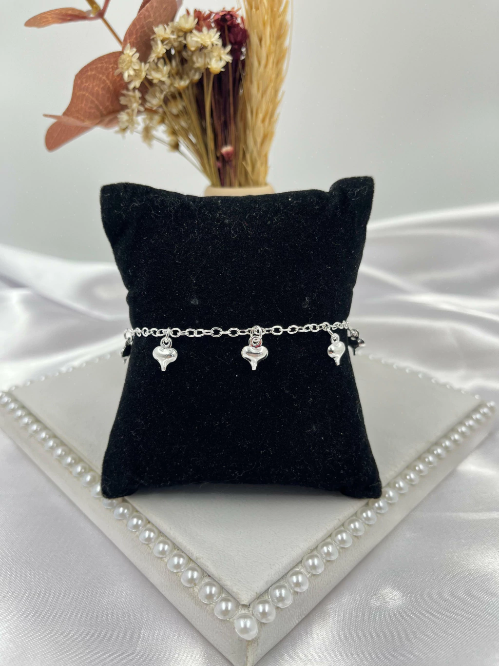 Essa pulseira é folheada com 20 milésimos de prata, garantindo brilho intenso e durabilidade superior. Seus pingentes de coração trazem um toque romântico, ideal para quem busca acessórios que unem elegância e estilo.